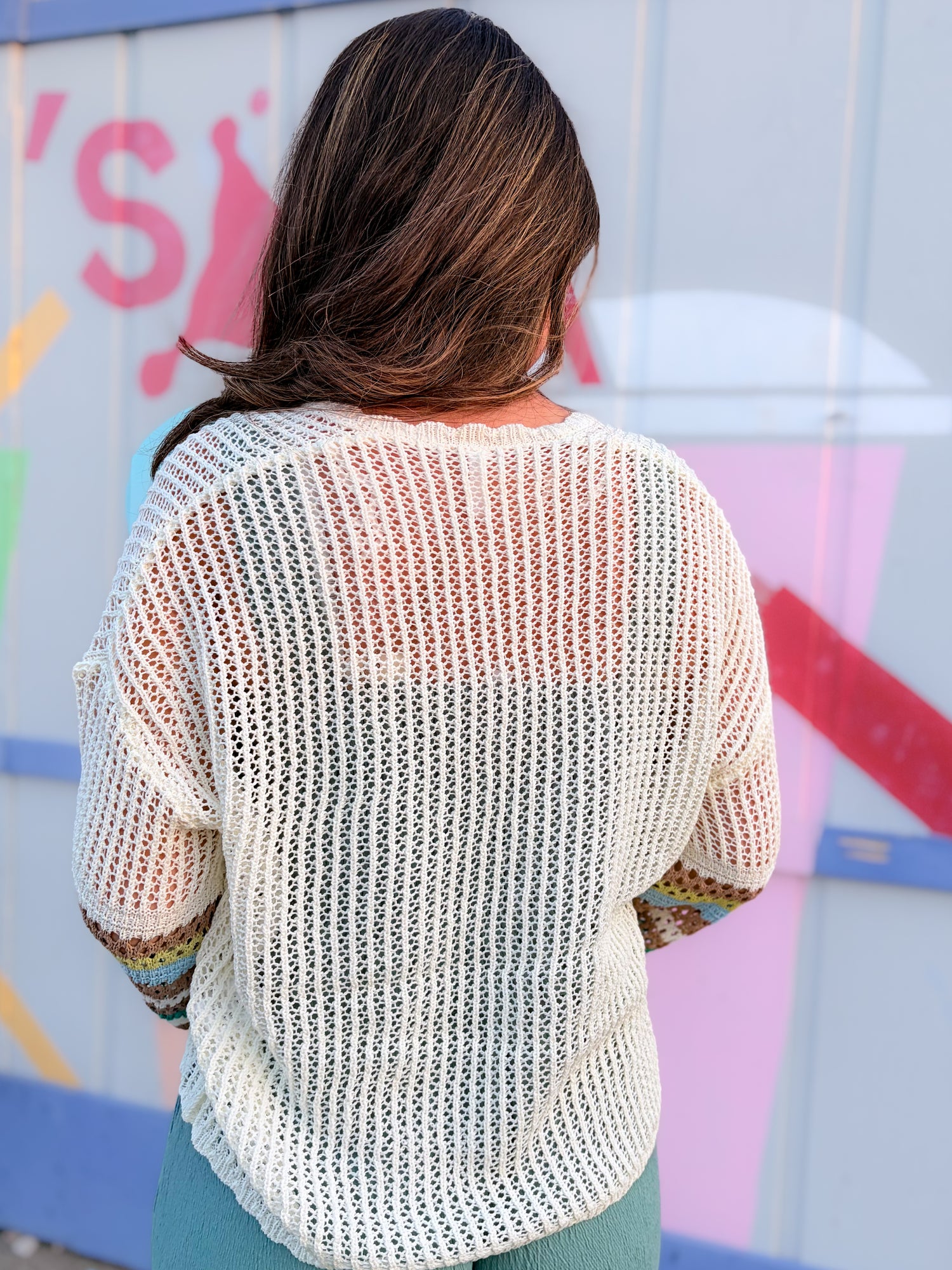 Meet your new go-to layering essential! The Kaleidoscope Cardigan combines a crisp white base with playful multicolor striped bell sleeves that flutter with every move. Featuring a charming tie front closure and delicate crochet-style knit throughout, this piece brings effortless bohemian flair to any outfit. Whether you're dressing up a casual look or adding dimension to your everyday style, this cardigan delivers personality and comfort in one delightful package. Perfect for those who love a little color and texture mixed with timeless elegance!
